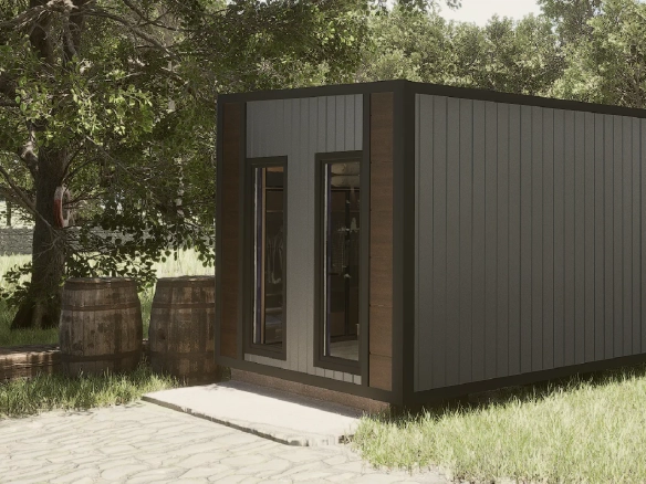 Our cozy building is constructed with a strong steel frame, 80 mm exterior sandwich panels, and 100 mm Rockwool insulation on the inside. It is completed with a smooth drywall finish, painted to the customer’s specification. Triple-glazed windows provide excellent thermal performance and noise reduction. The cabin comes with fully finished vinyl or laminate flooring for easy maintenance, as well as a fully fitted bathroom and kitchen. Additional external and internal design options are also available.