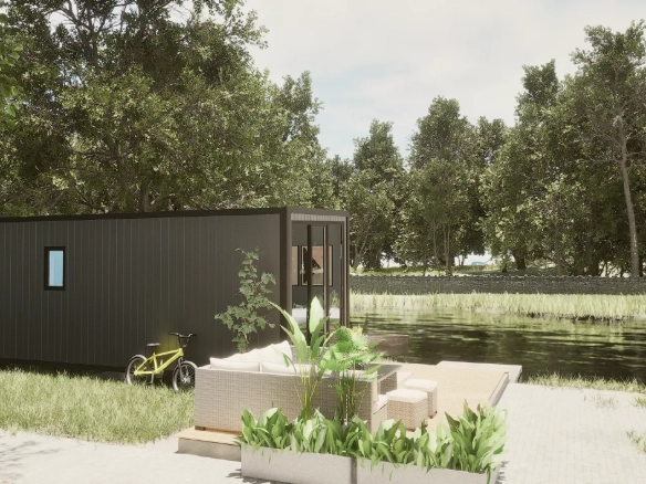 This 12 m x 3.5 m modular home features two bedrooms, a modern open-plan living and kitchen area, and a fully finished bathroom. The design is complemented by a spacious 3.3 m x 12 m front terrace with a Perspect roof, creating the perfect outdoor area for relaxing or entertaining.